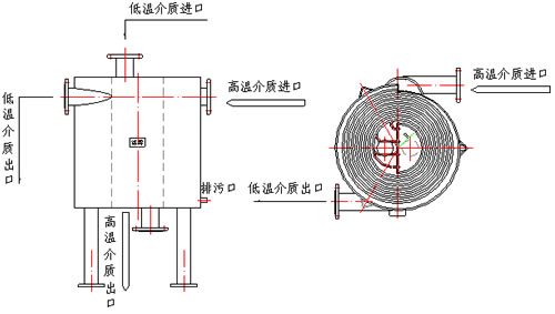 ○2可拆式Ⅱ型 可拆式Ⅱ型換熱器管內(nèi)通道為閉式,介質(zhì)螺旋狀運(yùn)行,管外通道介質(zhì)上下直通運(yùn)行,主要適用于無壓力或兩個(gè)通道壓差大的場合,管內(nèi)通道走壓力大、腐蝕嚴(yán)重者。這樣可節(jié)省材料且布局更趨合理性。