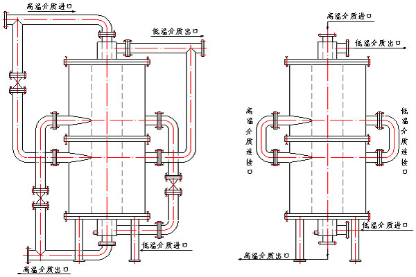 Ⅲ型簡圖 2、可拆式Ⅲ型可兩臺(tái)立式組合安裝,并聯(lián)或串聯(lián)運(yùn)行(如下圖),減小安裝位置,可提高冷凝效果,加大被加熱介質(zhì)使用溫度。